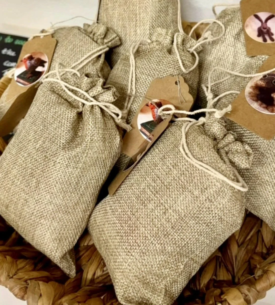 In my unique, plastic-and-packaging-free kits, you will receive a hessian bag holding your wool and tools, which you then empty and fill with rice to make a plastic-free alternative and a very satisfying-to-use rice bag pad!